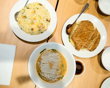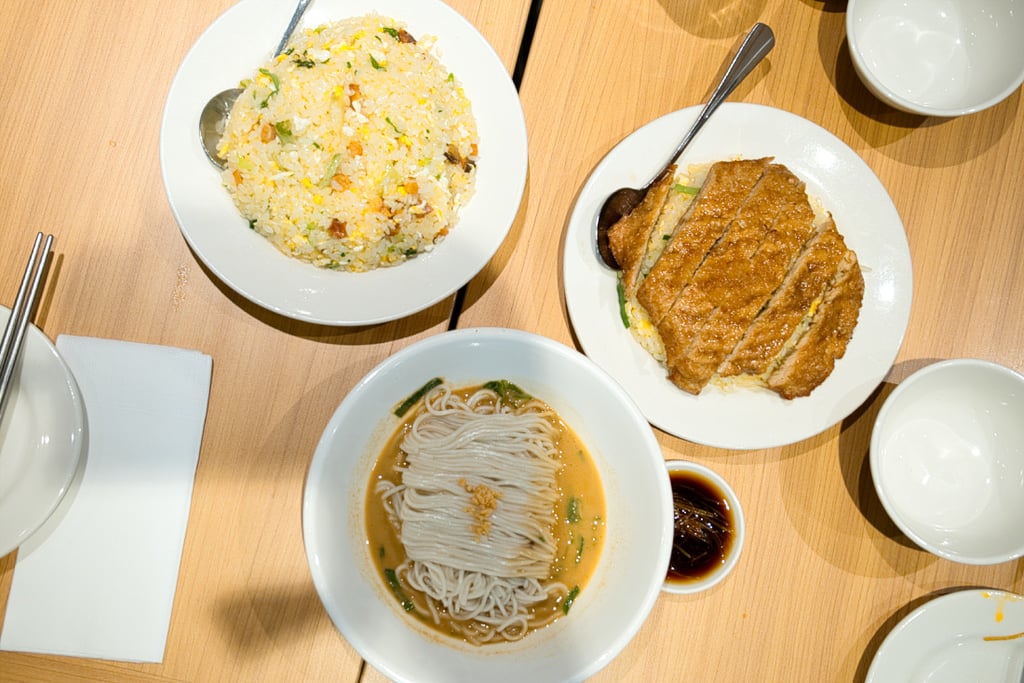 From Top left, Salted fish fried rice, Pork chop with egg fried rice and Machang noodles in peanut sauce.