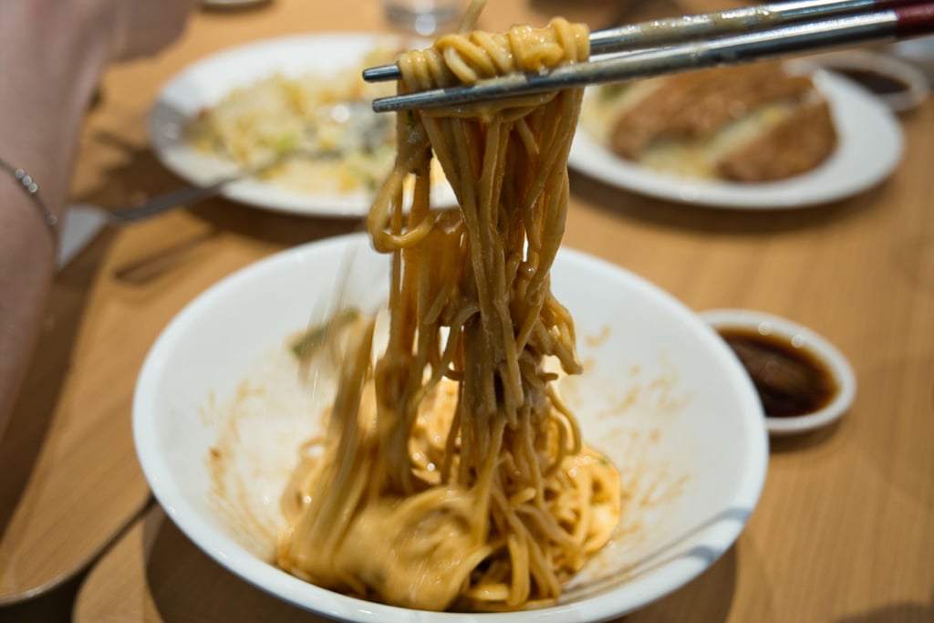 The sesame and peanut sauce is very thick but a bit bland relative to say eat fresh.