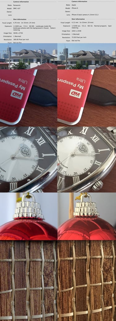 From the samples above, two things are apparent. The LX7 produces cooler images while the iPhone 6 is warmer (less blue, more yellow) on Auto White Balance. You may have noticed the slight difference in sizes (resolution) since the LX7 has a 10MP sensor while the iPhone has 8MP.