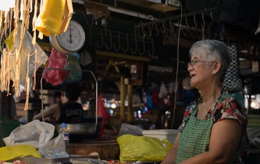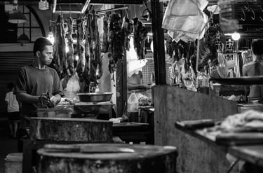 I need an interesting historical write-up of the area to compensate for yet again a quick and dirty shoot (maybe a 5-minute walkthrough of mainly the meat/pork section at noon). My first visit to the place at noon was a quieter affair compared to my early morning trip when the place was bustling with buyers, sellers, street vendors, trikes, and jeepneys snaking to and from the market area. There is plenty to see and buy in the center of the market that you wouldn’t normally find in your favorite grocery or "organic" fresh market. For one, everything (meaning all parts of an animal and greens that grow in the Philippines) looks fresh! You can tell because greens are not half-dead and meats don’t smell (really) as they do in some grocery stands. You’ll find hard-to-find parts as well... no, I’m not talking about your Ford Explorer but pig hands, feet, toes... You name it. They have it. Oddly enough, they call some foodstuffs different over there. For instance, what looks like "kalamay" or "biko" (sticky rice dessert) is called "bibingka" (rice cake)... Maybe they belong to the same family of desserts.