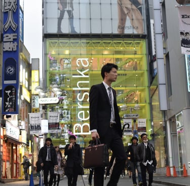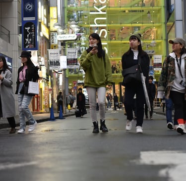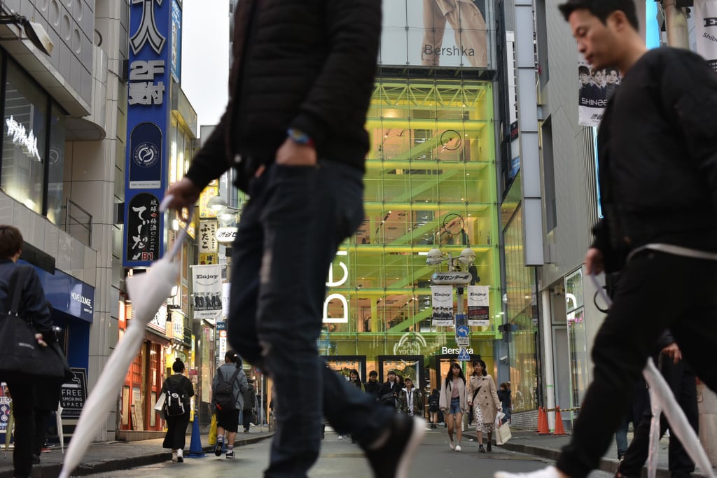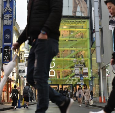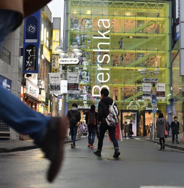 Categorizing and sorting through a photo set. Here's a few of the notable Bershka building that glows lime green. Staircases are visible from the outside like a real life catwalk. Shibuya Center- Gai Street is famous for the young fashion set in Tokyo.
