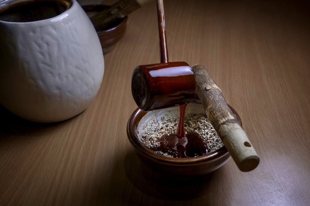 The Tonkastsu sauce is served un-finished. Wooden pestle is provided to allow you to grind the sesame seeds before you mix in the sauce.